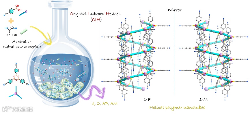 近日,中国科学院福建物质结构研究所张健研究员团队创新性地提出了一种分级自组装策略,通过动态共价键与非共价相互作用的协同效应,首次实现了纯手性螺旋聚合物纳米管的单晶合成。该研究采用市售原料通过一锅法反应成功构建了手性螺旋聚合物纳米管,其形成机制基于硼氧烷结构单元的原位生成,进而自组装形成螺旋骨架与纳米管结构。在组装过程中,动态共价键(B-N、B-O)驱动聚合物主链形成,而纵向氢键(C≡N•••H-N)相互作用促使螺旋结构卷曲为封闭纳米管,相邻芳环间丰富的π-π相互作用则进一步稳定了该结构。研究团队基于单晶-单晶(SCSC)转化过程(从线性链到螺旋纳米管)及合成过程中圆二色(CD)光谱的实时监测,提出了结晶诱导螺旋(CIH)纳米管的分级自组装形成机制。值得注意的是,由于纳米管内富含N/O官能团以及大量共价/非共价相互作用,该螺旋聚合物纳米管表现出优异的亲水性和水稳定性,研究人员还系统研究了其质子传导性能。该合成方法展现出良好的普适性,可适用于多种前驱体。研究发现,由非手性前驱体制备的螺旋聚合物纳米管单晶均呈现单一手性特征,通过手性诱导可获得对映体过剩的纳米管;而使用手性前驱体则可直接得到单一手性螺旋聚合物纳米管。值得关注的是,这些纳米管材料均表现出显著的光致发光特性。