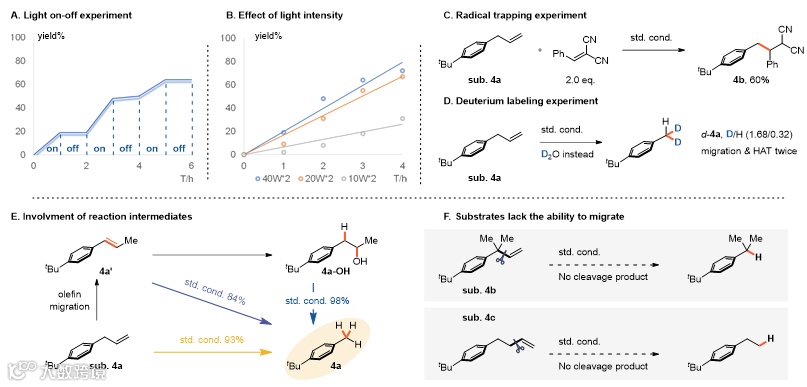 深入的机理实验为提出的反应路径提供了有力支持:光开关(on-off)实验排除了自由基链式机制;光强与反应速率呈正相关;Stern-Volmer淬灭实验证实烯烃是激发态光催化剂的主要淬灭剂;自由基捕获实验(使用苄叉丙二腈)成功检测到关键的苄位自由基中间体;氘代水(D2O)实验显示产物苄位氘代比例为1.68:1.32,符合烯烃迁移及两次HAT事件的机理假设;关键中间体(如迁移生成的苯乙烯4a'及其水合产物4a-OH)在控制实验中被检测或验证可高效转化为最终产物;而设计用于阻断迁移途径的底物(如无苄位质子或高烯丙基芳烃)在标准条件下反应性显著降低。