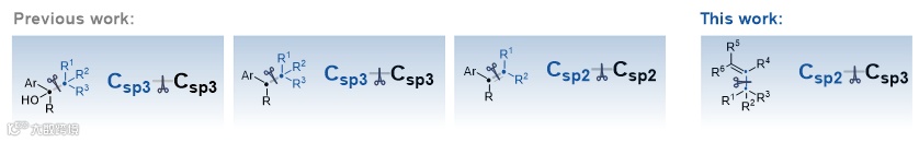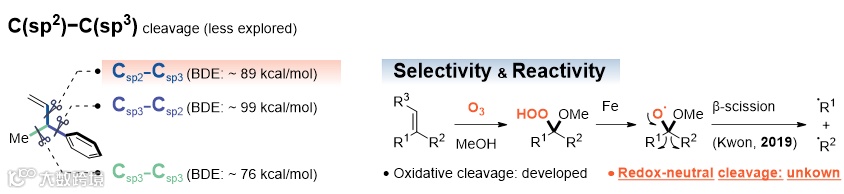 在众多C–C键断裂目标中,非极性烃类惰性C–C σ键的选择性裂解最具挑战性。尽管C(sp2)=C(sp2) π键的断裂研究已较为成熟,但C(sp2)–C(sp3) σ键的活化仍主要局限于极性结构(如酰基–C(sp3)键)。由于分子中常存在多个键能相似的C–C σ键,实现非极性C(sp2)–C(sp3) σ键的选择性断裂面临较大挑战,现有方法有限,亟需发展新策略。例如,Kwon团队发展的Fe(III)/O3体系,通过氧自由基介导的β-断裂过程实现了C(sp2)–C(sp3)键裂解,但通常需分步低温操作。因此,开发更为便捷、条件温和且不依赖化学计量氧化剂的策略是该领域的重要方向。