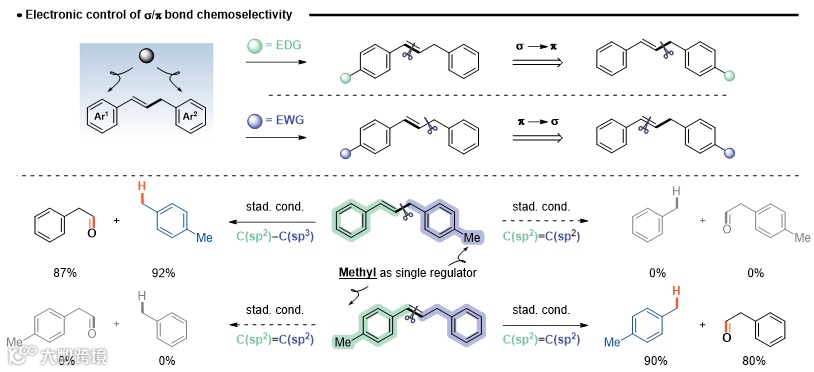 研究还揭示了反应的选择性规律:当分子中同时存在可裂解的C(sp2)=C(sp2)键和C(sp2)–C(sp3)键时,C–C键断裂的选择性主要由相连芳环的电子云密度决定,优先发生在富电子芳基一侧。通过简单改变甲基取代位置或引入吸电子基团(如氰基、氟),可精确调控裂解位点,甚至实现从C(sp2)–C(sp3)键到C(sp2)=C(sp2)键断裂的完全切换。