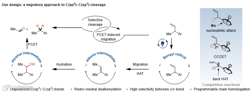 香港科技大学黄湧教授与深圳湾实验室陈杰安研究员团队长期致力于烃类化合物的活化新方法研究(前期工作参见:Angew. Chem. Int. Ed. 2017, 56, 6896; Angew. Chem. Int. Ed. 2018, 57, 2174; iScience 2020, 23, 10139)。基于烯烃官能团化的工作积累,该团队先后实现了无张力脂肪醇及烷基芳烃中C(sp3)–C(sp3)键(Cell Rep. Phys. Sci. 2022, 3, 100763; J. Am. Chem. Soc. 2023, 145, 12284)以及烯烃C(sp2)=C(sp2)键(Nat. Commun. 2024, 15, 6227)的选择性光催化裂解。近日,该合作团队在《自然-通讯》(Nature Communications)报道了一种氧化还原中性的光催化策略,实现了芳基烯烃的脱烯丙基化反应(hydrodealkenylation),选择性断裂C(sp2)–C(sp3) σ键。与传统氧化裂解路径不同,该方法无需外源氧化剂,并实现了裂解片段(芳烃与醛)的双重高效捕获。