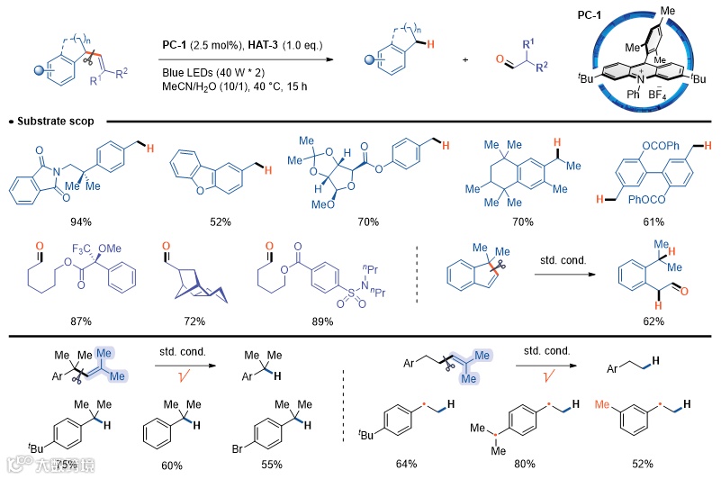 机理研究表明,芳基烯烃底物可被激发态吖啶鎓盐光催化剂单电子氧化,生成芳基自由基阳离子。该中间体经历质子耦合电子转移(Proton-coupled electron transfer, PCET)形成苄位自由基,随后发生烯烃迁移(由氢原子转移试剂HAT-3,即五氟苯硫酚介导)生成共轭程度更高的苯乙烯类中间体。此中间体经历水合作用、进一步的PCET诱导的β-断裂以及烷基自由基的氢原子转移(Hydrogen atom transfer, HAT),最终完成C(sp2)–C(sp3)键裂解。值得注意的是,芳基自由基阳离子易发生多种竞争路径(如亲核加成、碳正离子耦合电子转移(Carbocation-coupled electron transfer, CCET)、逆向HAT等),因此反应序列的精准调控是实现高选择性的关键。实验证实,HAT试剂的选择对抑制副反应、提高效率和选择性至关重要。