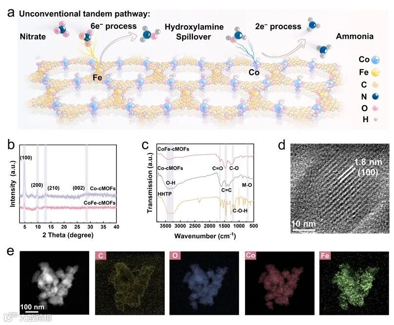 图1a中描述CoFe-cMOFs位点主导将硝酸根(NO3−)还原为关键中间体*NH2OH(消耗6个电子),随后该中间体“溢出”到邻近的Co位点,被进一步还原为最终产物氨(NH3)(消耗2个电子)。图1b-c的PXRD和FTIR证明了CoFe-cMOFs的成功合成及其基本化学键构成。图1d-e的高分辨TEM和元素分布图则清晰展示了材料具有规整的孔道结构(约1.8 nm间距)以及Co、Fe元素在整个材料中的均匀分布,证实了Fe通过离子交换成功引入到Co-cMOFs框架中。