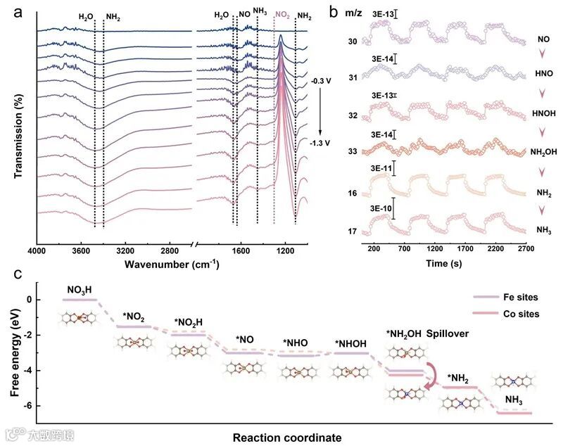 原位同步辐射傅里叶变换红外光谱(SR-FTIR)和在线微分电化学质谱(DEMS)检测到了反应路径中涉及的一系列关键中间体信号。理论计算(DFT)自由能图则为整个[6+2]路径提供了解释:计算表明在Fe位点上,将NO3−逐步还原至*NH2OH中间体在能量上更有利(特别是避免了NO2的脱附),并且NH2OH在Co位点上的吸附和进一步还原成NH3也更为稳定和高效。这些实验和理论结果相互印证,共同确立了Fe位点主导的“NO3−→ NH2OH (6e⁻)”和Co位点主导的“NH2OH → NH3 (2e⁻)”这一独特的非传统串联机制。