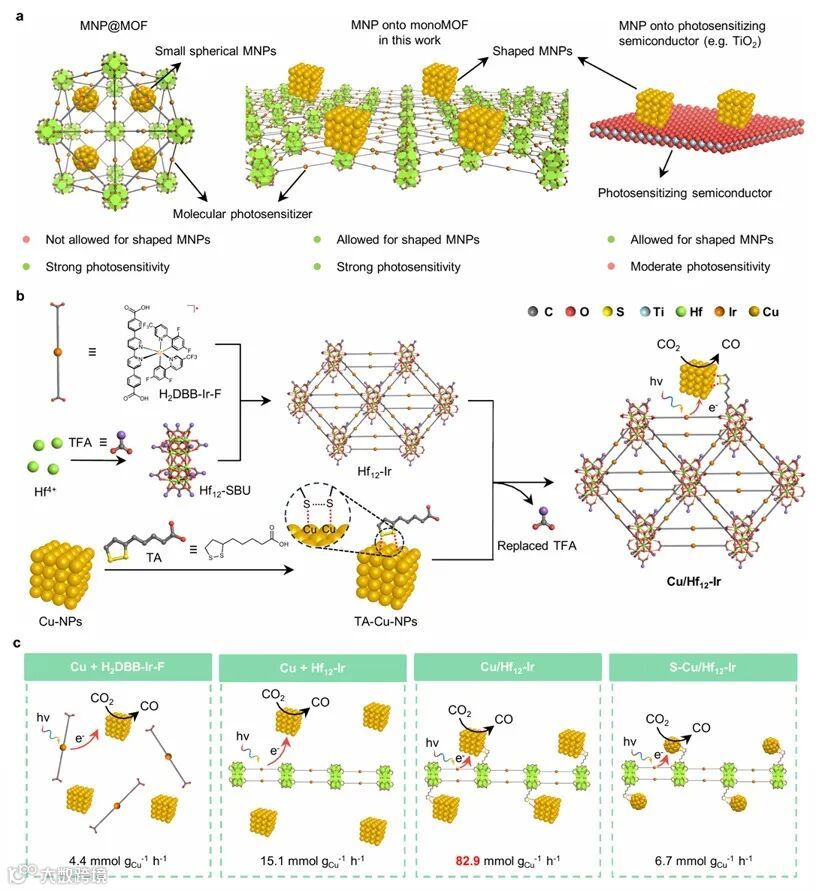 北京大学蓝光旭研究团队提出了一种新型单层MOF(monoMOF)载体构筑策略,用于高效负载大尺寸特定形貌的金属纳米颗粒。为验证该方法的普适性,选择具有光敏特性的Hf12-Ir单层MOF作为模型载体,立方体铜纳米颗粒作为典型代表。通过硫辛酸双功能配位桥接策略——其二硫键与Cu-NPs通过Cu-S键结合,羧酸基团与Hf12-Ir单层中的Hf12簇配位,成功构建Cu/Hf12-Ir复合催化材料。在光催化CO2还原反应中,该复合材料展现出优异性能:CO生成速率达到82.9 mmol·gCu-1·h-1,CO选择性达98.3%。这一性能表现较传统负载体系(如小尺寸球形MNPs复合系统)实现了数量级提升,充分证明了单层MOF载体在异形MNPs负载与界面协同调控方面的独特优势。