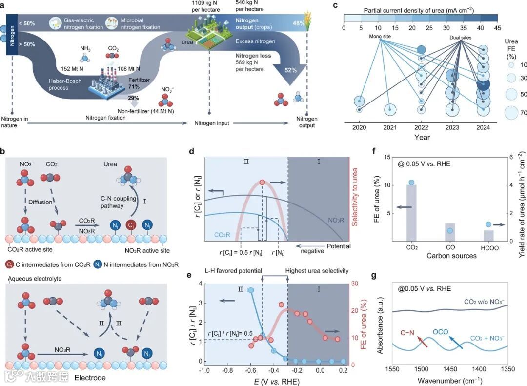 首先,结合全球氮循环损失数据,作者认识到硝酸盐和氨的排放不仅浪费资源,还加剧水体富营养化;接着,通过对比不同碳源和电位区域的产物分布,以及原位ATR FTIR谱和动力学分析,他们发现传统的Langmuir–Hinshelwood型C–N偶联并不能完全解释尿素生成的早期高选择性,而更为简洁高效的 Eley–Rideal 路径—— CO2 分子直接与表面氮中间体(如*NO2)偶联——才是主导机理;文献汇总的气泡图和速率–电位曲线进一步表明,在NO3⁻与CO2共同还原的中间电位区间,C/N中间体产生速率的匹配对于高效合成尿素至关重要;而不同碳源对比实验和原位光谱则直接印证了CO2分子本身能参与C–N键形成。