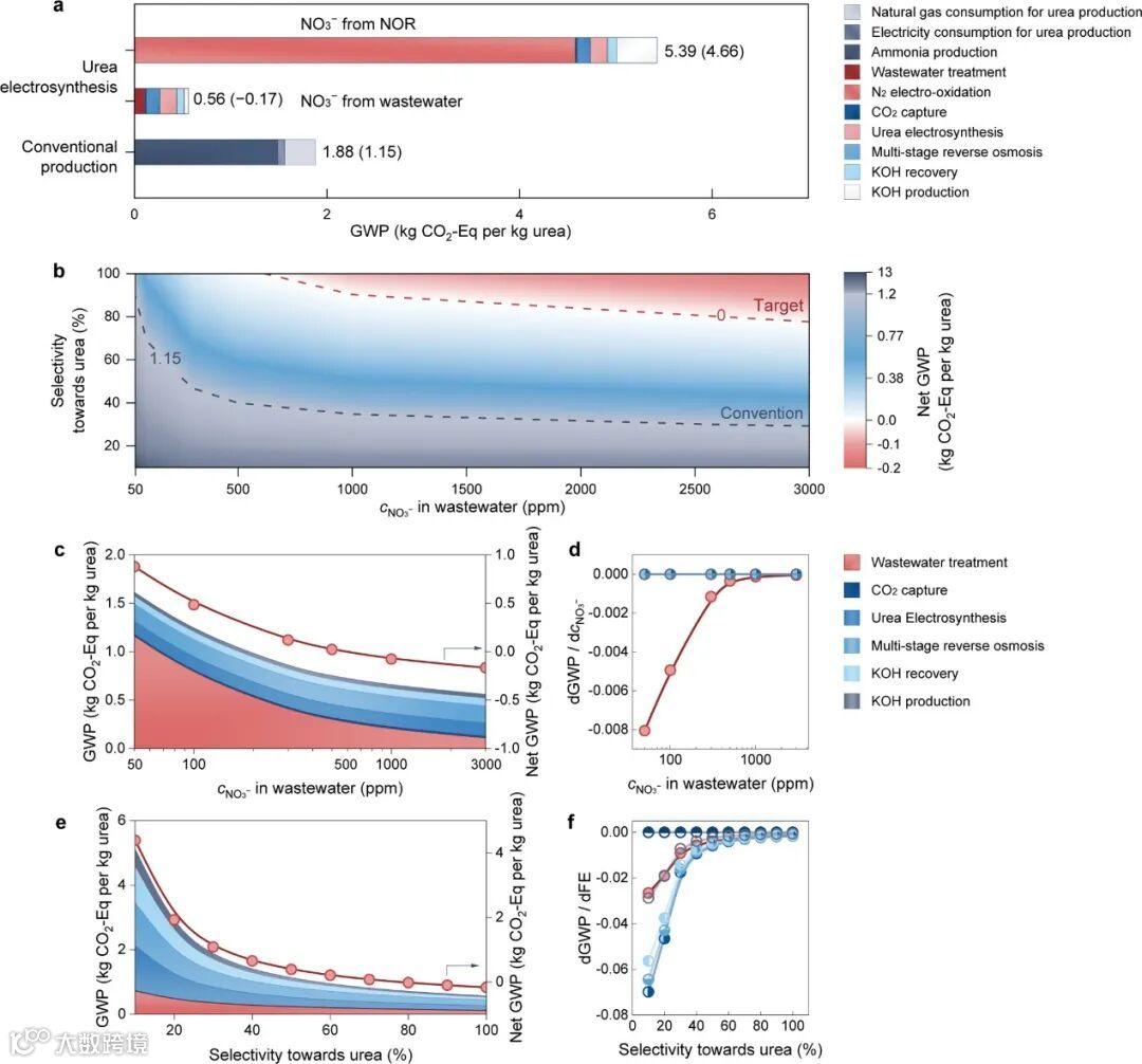 生命周期评估结果表明:以电化学氮氧化(NOR)产出的硝酸盐制备尿素,每公斤尿素的CO2当量高达5.49 kg;而直接利用含NO3⁻的废水,仅需0.56 kg CO2/kg;传统Haber–Bosch法制备尿素则约为1.88 kg CO2/kg。当考虑电合成过程中CO2的消耗,废水源NO3⁻路径甚至可实现负碳排放。当废水中NO3⁻浓度 ≥ 50 ppm 且电催化尿素选择性 > 80%(B-Cu 催化剂可实现此水平)时,电合成路径即可优于传统工艺;若NO3⁻浓度高达3000 ppm,则只需约40% 的尿素选择性就能超越传统Haber–Bosch法。