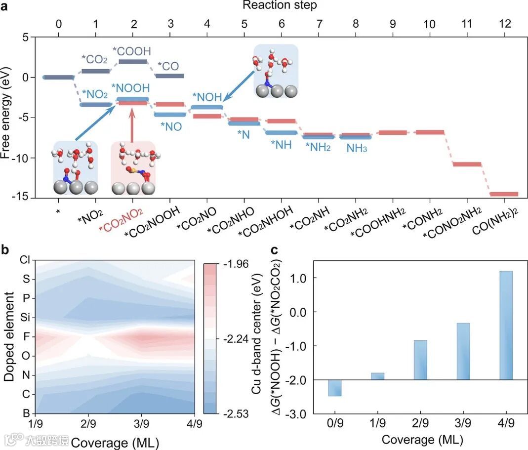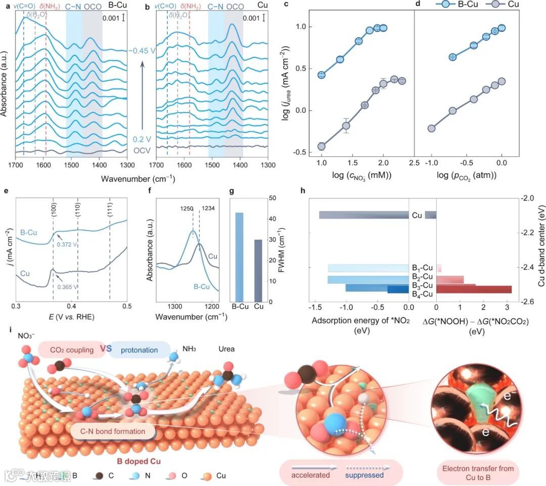 一系列原位和动力学实验揭示了C–N偶联的本质机理:首先,通过 ATR FTIR 监测到 1470 cm-1处的C–N键振动信号在B-Cu催化剂上于更正向的电位下即出现,并在CO2–15NO3⁻同位素标记实验中发生明显红移,表明CO2分子直接参与与表面氮中间体(*NO2)的偶联,其速控步骤即为此化学偶联;而同一条件下,原铜表面该信号出现更迟、强度更弱,印证了硼掺杂对C–N偶联的促进作用。进一步的CO2分压和NO3⁻ 浓度依赖性测试显示,尿素生成速率与CO2分压呈线性关系,而对NO3⁻浓度则在一定阈值后趋于饱和,与Eley–Rideal型机理完全吻合。原位OH⁻吸附、电化学活性表面以及FTIR 对*NO2吸附峰位和半峰宽的对比则佐证了B-Cu比纯铜表现出更弱的氧亲和性和NO2吸附强度。最后,结合NO2氢化与CO2偶联能垒随吸附能的相反趋势及d带中心调整的理论分析,可知掺B不仅抑制了*NO2的过度氢化,还加速了与CO2的直接偶联。