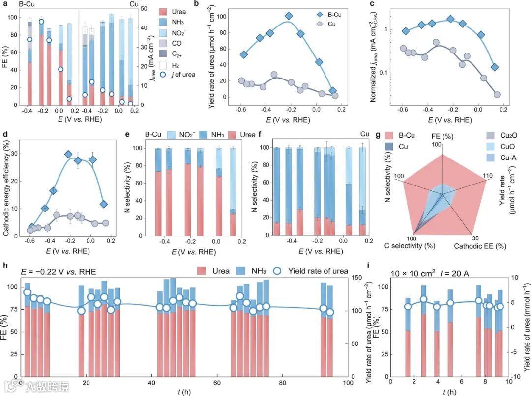 在含 0.1 M KNO3+ 1 M KOH 的流动电池中,B-Cu 在−0.22 V vs. RHE 时即可实现高达 101.2 μmol h-1cm-2的尿素产率和 80.1% 的法拉第效率,而同电位下商业Cu纳米颗粒仅能达到 <25% 的选择性和 <20 μmol h-1cm-2的产率。尽管B-Cu的电化学活性表面积(ECSA)更大,其单位活性面积归一化后的部分电流密度仍远超原铜,表明其内在催化活性大幅提高。能效方面,B-Cu在−0.22 V时的阴极能效峰值接近30%,而纯铜不足10%。动力学分析和选择性分布进一步显示,B-Cu 优先促进NO3⁻ 还原产生的*NO2与CO2偶联生成尿素,并有效抑制侧反应(如氨的生成或氢析出),其性能优势并非简单源于反应速率匹配,而是内在的表面化学调控效应。控制组(Cu2O、CuO 及维生素C还原制备的Cu-A)均未能显著提升尿素产率或选择性,说明仅氧化态改性或非特异性还原方法难以替代硼掺杂的关键作用。长期测试也表明,B-Cu 在连续100 h操作后仍能保持≥ 65% 的高尿素选择性,且放大至100 cm²电极面积、20 A电流的实际装置中,10 h内选择性稳定在50%以上,没有明显性能衰减。以上皆说明硼掺杂不仅赋予Cu催化剂优异的内在活性和选择性,还在不同测试规模和运行时长下保持稳定,为电催化尿素合成的工业化应用提供了坚实基础。