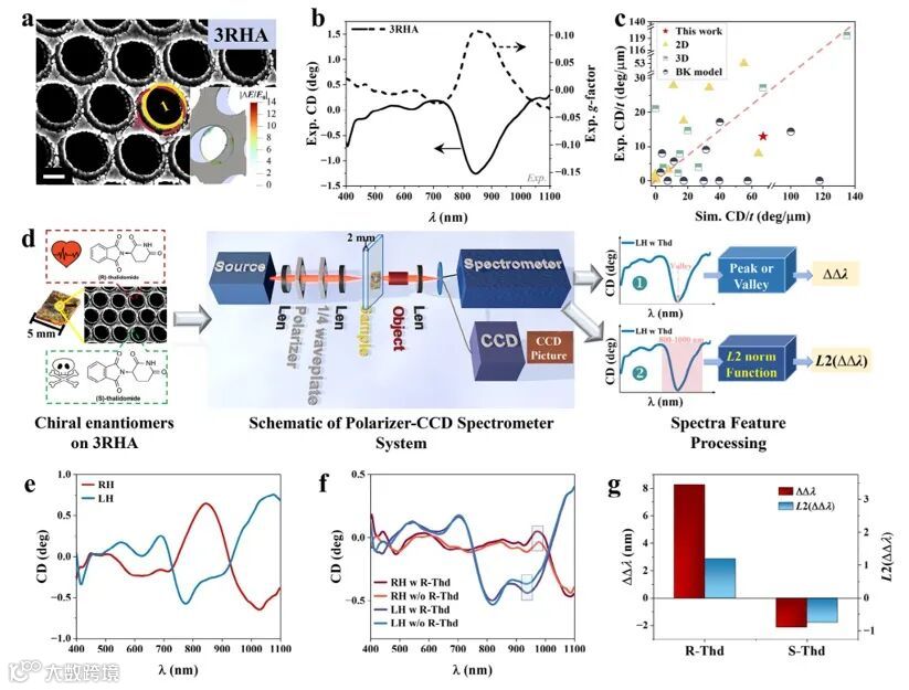 图2. 实验制备3RHA的手性分析:a)SEM图(例尺为200 nm),插图为电场|∆E/E0|分布,b)实验的CD和不对称g因子光谱,c)比较仿真和实验中3RHA与已有研究关于2D、3D、BK模型CMs的CD/t响应,d)手性对映异构体作用于结构、偏振器-CCD光谱仪系统检测、ΔΔλ和L2(ΔΔλ)两种光谱分析方法,e)LH-和RH-结构的CD光谱,f)对比LH-和RH-结构有和没有R-Thd时的CD谱图,g)R-Thd和S-Thd的ΔΔλ和L2(ΔΔλ)对比图