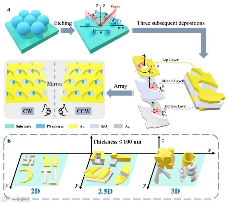 图1. a)3RHA设计和制造过程:紧密六方堆积的 PS 球经过刻蚀得到目标直径的微球阵列,以不同的入射角和方位角进行 Ag、SiO2 和 Au 的三次连续沉积,得到3RHA薄膜的逆时针和顺时针的镜像结构;b)2D、2.5D、3D CMs结构的类别示意图