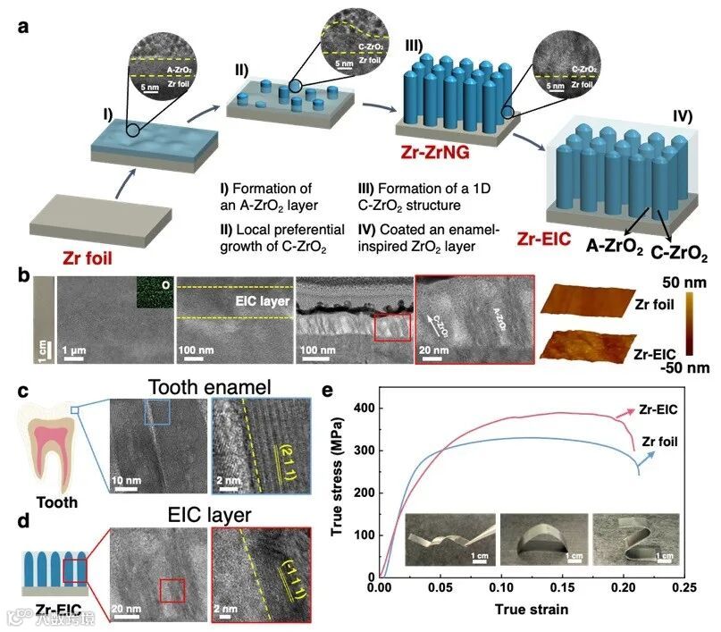 图1. 类牙釉质陶瓷层强化Zr foil的制备过程、微观结构及拉伸性能
