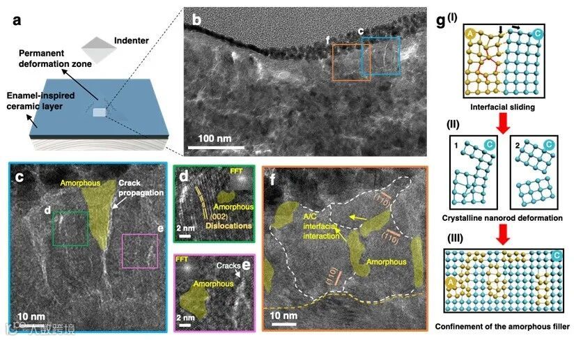 研究团队系统分析了类牙釉质陶瓷层的永久变形区,发现晶体ZrO2阵列结构的强支撑作用以及晶体/非晶界面独特的能量耗散行为,是实现金属材料兼具优异力学性能的关键。