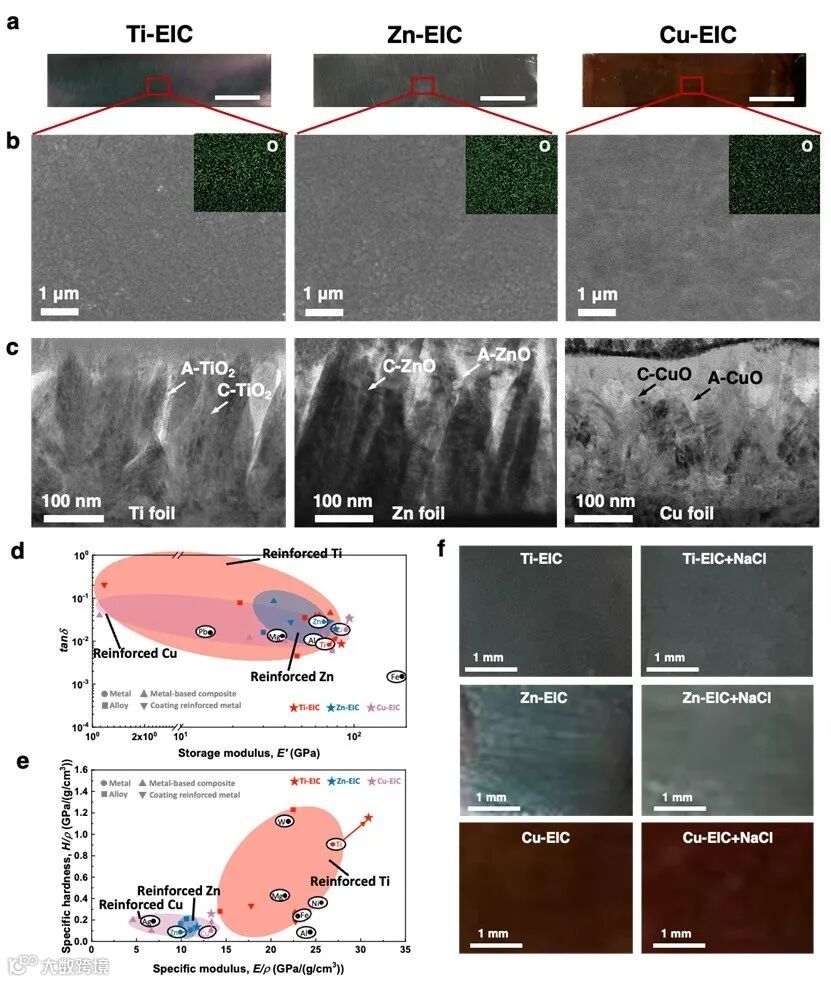 特别地,该强化策略具有良好的普适性,已推广至钛、锌、铜三种金属,并显著提升了这三种金属的综合力学性能和耐腐蚀性。其中,类牙釉质陶瓷层强化的金属钛的比模量达到了30.9 GPa/(g/cm3),与轻质金属(例如镁和铝)相当,同时表现出良好的生物相容性,展现出潜在的临床应用前景。