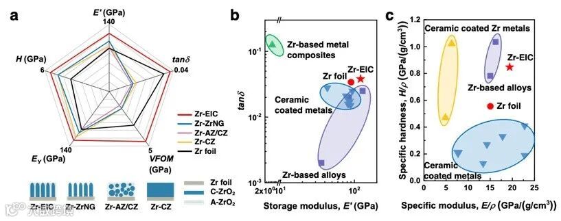 类牙釉质陶瓷层强化后的Zr foil兼具高刚度(121.3 GPa)和高阻尼(0.038),粘弹性品质因子达到了4.6 GPa,是传统工程材料(0.6 GPa)的7.6倍;同时具有优异的比模量(19.4 GPa/(g/cm3))和比硬度(0.85 GPa/(g/cm3)),表明通过轻量化的强化策略能够同步提升金属的模量和硬度。