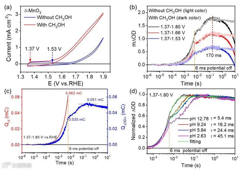 图3.(a)在有/无CH3OH电解液中,δ-MnO2的循环伏安曲线;(b)在6 ms电位脉冲宽度下,δ-MnO2在不同高电位下的EC-TA光谱曲线;(c)电子提取量和*OH物种累积量随施加电位时间的变化关系;(d)不同pH下*OH物种形成速率对比。