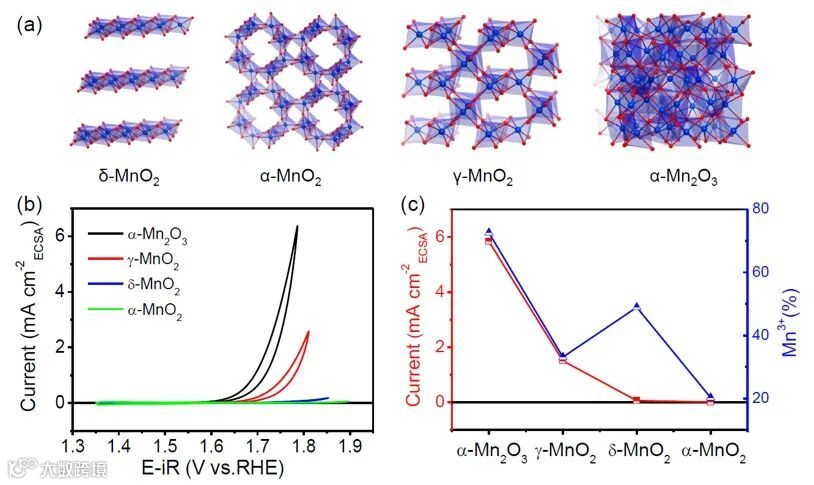 图4.(a)δ-MnO2,α-MnO2,γ-MnO2和α-Mn2O3的晶体结构;(b)四个MnOx催化剂ECSA归一化的循环伏安法曲线;(c)四种MnOx催化剂的OER活性与定量的Mn3+含量对比图。