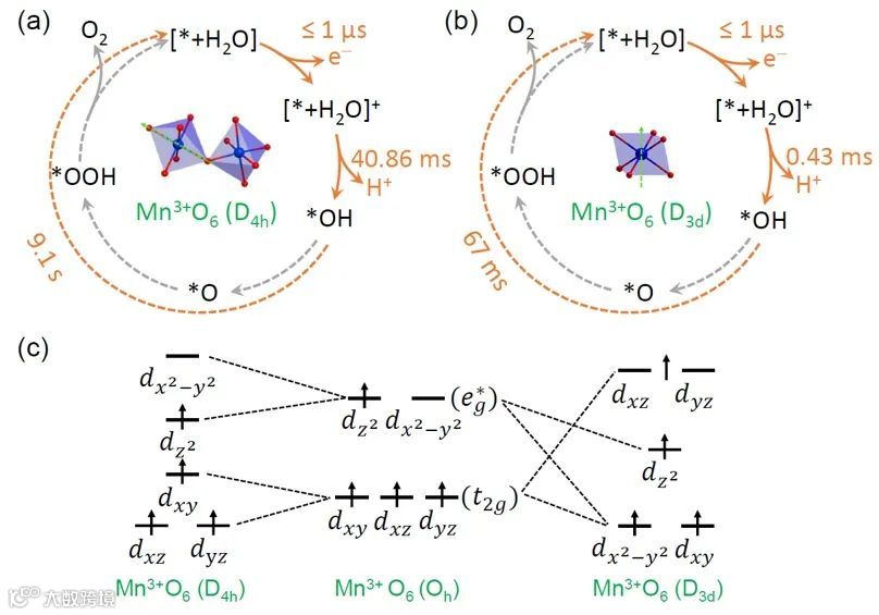 图6. 含有D4h对称性(a)和D3d对称性(b)的共顶点的Mn3+O6八面体活性中心的OER动力学循环机制示意图。(c)不同对称性MnO6八面体的能级分裂图。