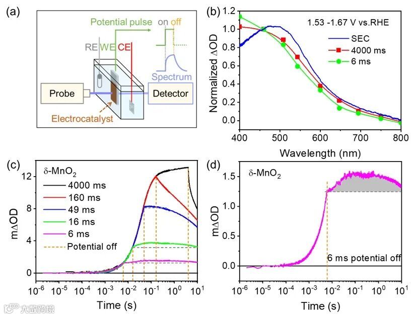 接下来作者利用自主研发的EC-TA光谱(图2a-c),实现了电位脉冲条件下中间物种的时间分辨检测。逐步减小施加的电位脉冲宽度(图2c),可对中间物种的形成、转化动力学进行直接跟踪探测,发现在电位脉冲宽度小于100 ms量级时,偏压中断后出现了一个瞬态吸收信号的持续积累过程(图2d),可能源于OER第一步中间物种*OH物种的积累。