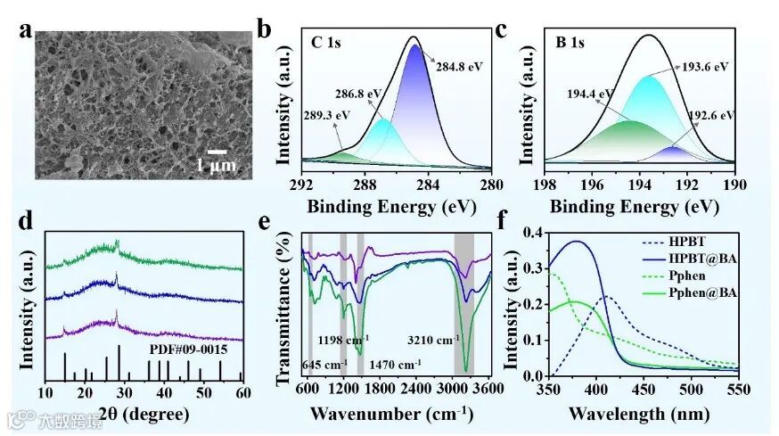 本文首先介绍了耐高温余辉材料的合成过程,将HPBT 和 Pphen 通过脱水诱导掺杂策略掺杂到 BA 的基体中,用 BA 加热它们的水溶液混合物,然后在 180 ℃ 下煅烧。合成的产物分别为HPBT@BA 和 Pphen@BA。然后通过SEM、XPS、XRD、FTIR和UV等表征手段研究了客体分子与BA基质间的相互作用,成功将客体分子加载到BA基质中。