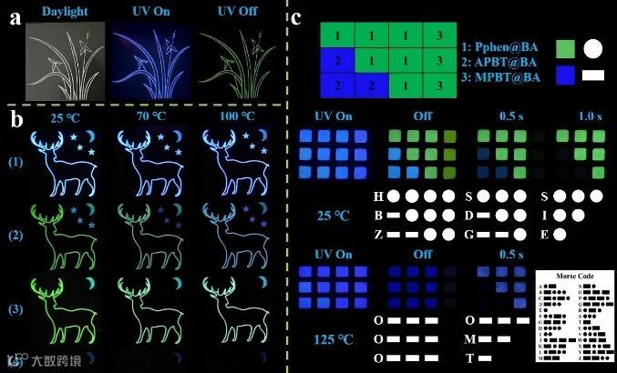 最后,基于材料的耐高温余辉特性,展示了其在信息加密领域的应用潜力。用不同材料填充图案,在紫外光照射和关闭后,图案的余辉颜色和形状会随时间和温度发生丰富变化,可实现多重防伪和信息加密。例如,通过莫斯电码图案,能在不同时间和温度下传递不同信息,大大提高了信息安全性。