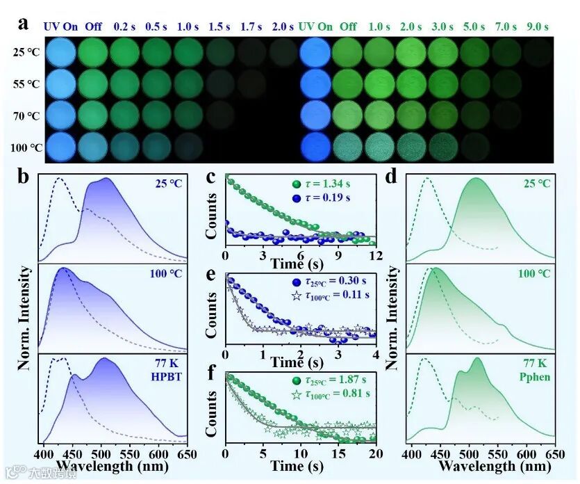 然后,为了更深入的了解其耐高温余辉特性,HPBT@BA 和 Pphen@BA在 365 nm 紫外灯激发下,它们分别呈现深蓝色发光和绿色余辉,余辉时间长达 2.0 s 和 9.0 s。而且,从 25 ℃ 升温到 70 ℃,材料的发射颜色和余辉时间肉眼几乎观察不到变化,升高到 100 ℃ 余辉从绿色变为蓝色。并通过测量 77 K HPBT 和 Pphen的瞬时和延迟荧光光谱,证明HPBT@BA 和 Pphen@BA的磷光来源于掺杂的客体分子本身。