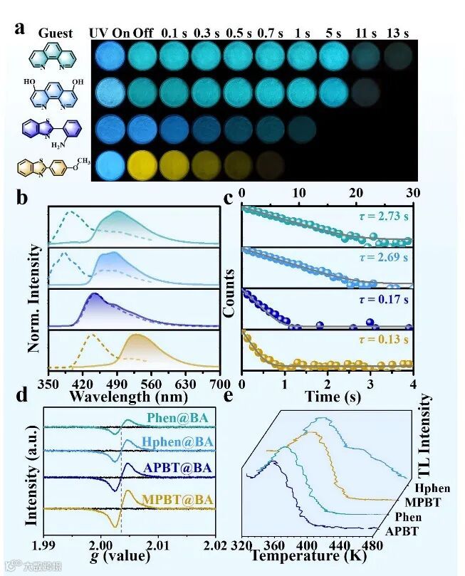 此外还通过掺杂多种结构相似但化学基团不同的客体分子,如 Phen、Hphen、APBT 和 MPBT,进一步验证了该策略的普适性。这些材料均展现出强烈且颜色可调的余辉,CIE 坐标在 (0.16, 0.13) 至 (0.36, 0.57) 之间,余辉持续时间为 0.7 s 至 13 s。