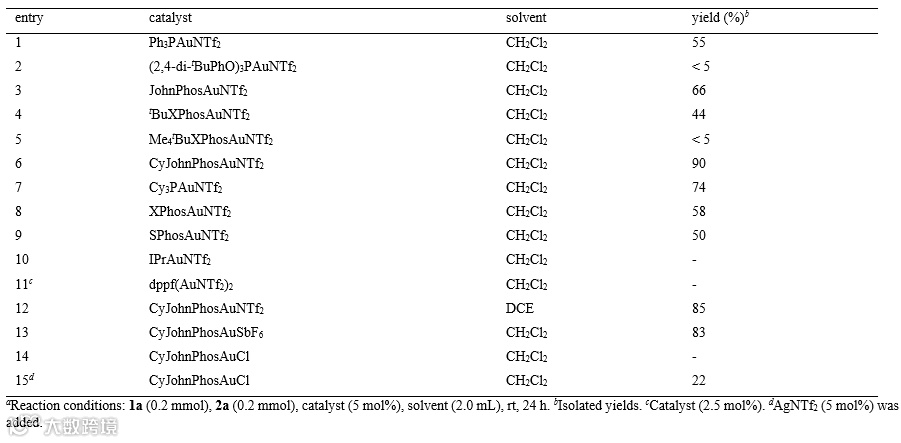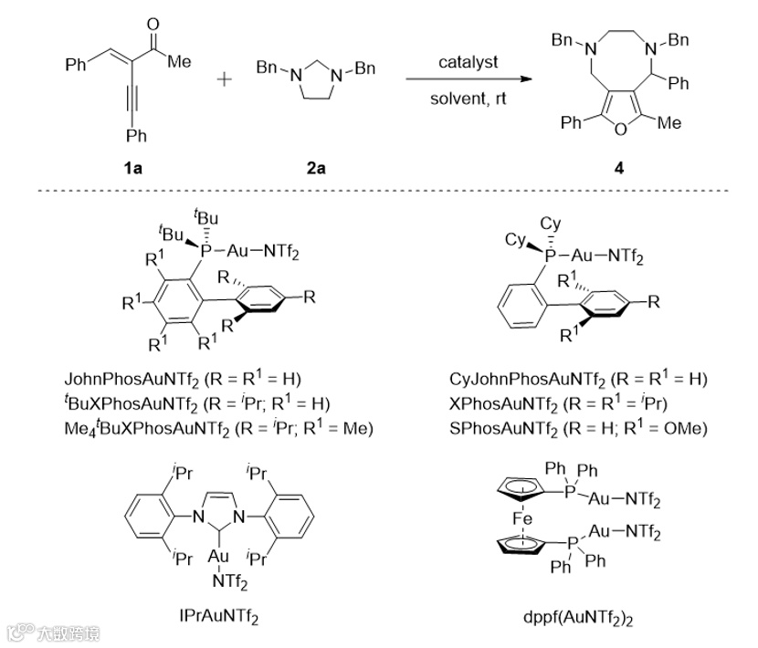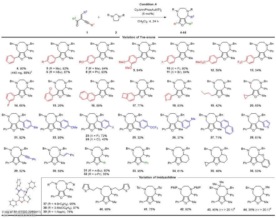 该课题组以烯炔酮1a和N-苄基咪唑烷2a为模版底物,筛选多种过渡金属催化剂后发现,仅金催化剂给出可能的结果。随后,他们转向金(I)催化体系(表1)。令人鼓舞的是,Ph3PAuNTf2催化下目标(5+3)环加成产物4的收率达55%(表1,条目1),而(2,4-di-tBuPhO)3PAuNTf2的催化活性可忽略不计(表1,条目2)。当使用JohnPhosAuNTf2时,收率提升至66%(表1,条目3)。增大配体空间位阻(如tBuXPhosAuNTf2或Me₄tBuXPhosAuNTf2)导致收率降至44%或几乎不发生反应(表1,条目4和5)。相反,使用CyJohnPhosAuNTf2降低配体的空间位阻需求,显著提高了反应效率,目标产物4的收率高达90%(表1,条目6),而进一步降低配体空间位阻(如Cy3PAuNTf2)则使收率降至74%(表1,条目7)。用空间位阻或电子效应更强的XPhosAuNTf2或SPhosAuNTf2替代CyJohnPhosAuNTf2时,对反应产生不利影响(表1,条目8和9)。值得注意的是,N-杂环卡宾金(I)配合物IPrAuNTf2和双齿膦金(I)配合物dppf(AuNTf2)2均未能促进反应(表1,条目10和11)。将溶剂由CH2Cl2换为1,2-二氯乙烷或阴离子由NTf2⁻换为SbF6⁻时,仍保持较高反应效率(表1,条目12和13)。使用CyJohnPhosAuCl时无反应发生(表1,条目14)。有趣的是,当使用CyJohnPhosAuCl/AgNTf2组合原位生成催化剂时,原位生成的 CyJohnPhosAuNTf2仅获得22%收率的产物4(表1,条目15)。最终,该(5+3)环加成反应的最优条件确定为:使用5 mol% 的 CyJohnPhosAuNTf2催化剂,在二氯甲烷中室温反应24小时,目标产物4的收率为90%(条件A,表1,条目6)。