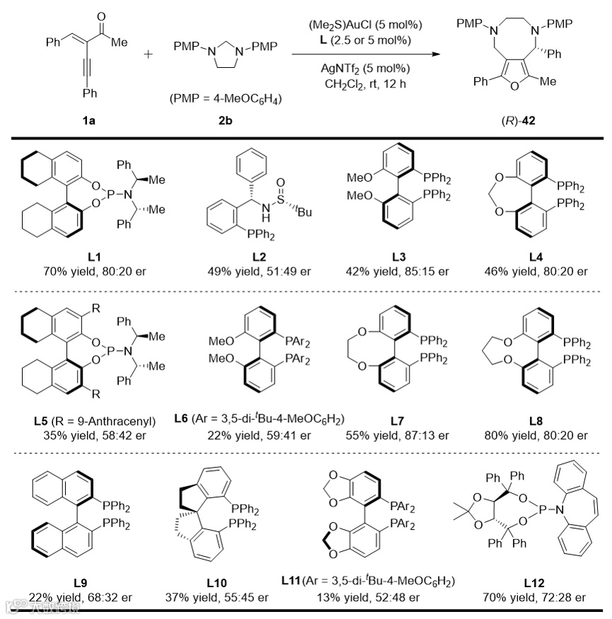 在完成消旋[5+3]环加成部分后,作者接下来聚焦于完成该反应的不对称版本,以制备手性的环辛[c]呋喃骨架。最初以烯炔酮1a和N-Bn咪唑烷2a作为模型底物,对一些可能的手性膦配体进行了评估,包括手性亚磷酰胺配体(S,R,R)-L1、手性亚磺酰胺膦配体(S,RS)-L2、手性双膦配体(R)-MeO-BIPHEP-L3及其变体(R)-C1-TunePhos L4,遗憾的是,这些配体都不适合该反应。但是当使用N-PMP咪唑烷2b替代2a时,除了L2几乎没有立体诱导作用外,其他3种配体都给出了有希望的结果,通过对这些配体加以修饰,最终确定通过改变L4的咬合角确定了最优配体L7。