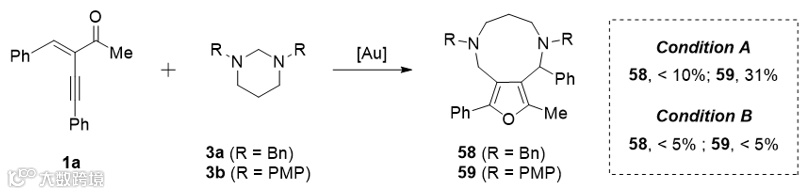 受到上述(5+3)环加成中的成功鼓舞,作者设想六氢嘧啶3可以被视为1,6-偶极前体,从而实现与Int-I的(6+3)环加成。这将为构建在天然产物中普遍存在的合成挑战的环壬[c]呋喃提供一种简单的方法。结果显示,在条件A下,烯炔酮1a与N-Bn六氢吡啶3a反应,仅检测到痕量的环加成物58。令作者感到高兴的是,当使用N-PMP六氢吡啶3b时,目标产物59的产率达到了31%。遗憾的是,烯炔酮1a与六氢嘧啶3a或3b的不对称环加成反应在条件B下几乎没有发生。
