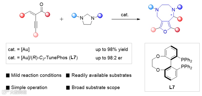 近日,五邑大学彭士勇课题组在Organic Letters 发表研究,报道了一种金催化的烯炔酮与咪唑烷的杂环化/(5+3)环加成串联反应。该反应提供了一种模块化、原子经济性的高效合成策略,能以中等至优异的产率构建具有重要药用价值的环辛烷[c]呋喃骨架。值得关注的是,通过使用(R)-C2-TunePhos 配体(L7),成功实现了该反应的不对称版本,获得了对映体比例高达98:2的手性产物。该工作通过环加成反应(n+3)构建中等大小的稠合呋喃环,为复杂天然产物及药物分子的合成提供了新路径。