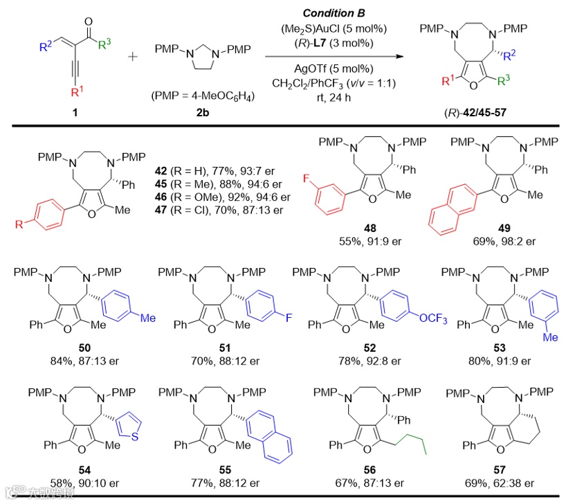 综上所述,该研究开发了金催化的烯炔酮与咪唑烷的(5+3)环加成串联反应,首次通过环加成反应构建环辛烷[c]呋喃骨架,以26-98%的产率构建41种环辛[c]呋喃衍生物,涵盖芳香基、脂肪基及环状底物,具有区域选择性优异具有底物易得、条件温和、官能团兼容性好等优势。另外通过手性双膦配体(R)-C2-TunePhos与AgOTf协同催化,成功实现该反应的不对称版本,获得对映体比例高达98:2的手性产物,拓展了金催化在中等环构建中的应用。