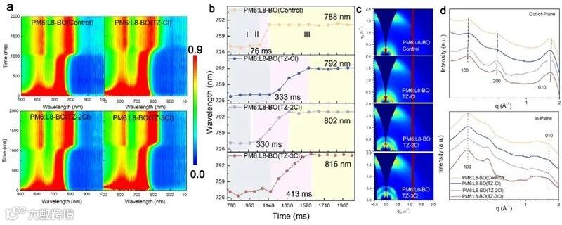 Figure 3. Time-dependent contour plots of UV-vis absorption spectra of PM6:L8-BO (with and without additives) blend films (a); the time evolution of L8-BO peak position and intensity in blend films; 2D GIWAXS patterns (c) and 1D GIWAXS profiles (d) of PM6:L8-BO blend films (with and without additives).