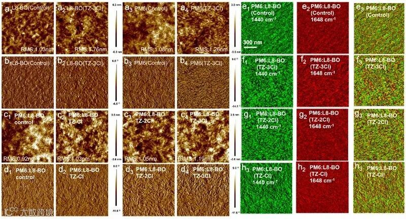 Figure 2. The AFM height images (a, c) and phase images (b, d) of PM6/L8-BO pure films and PM6:L8-BO blend films; AFM-IR images of blend film without additives and treated with TZ-3Cl mapped at the characteristic wavenumbers of 1648 cm−1 (e1, f1) and 1440 cm−1 (e2,f2); overlay of L8-BO and PM6 AFM-IR images (e3, f3).