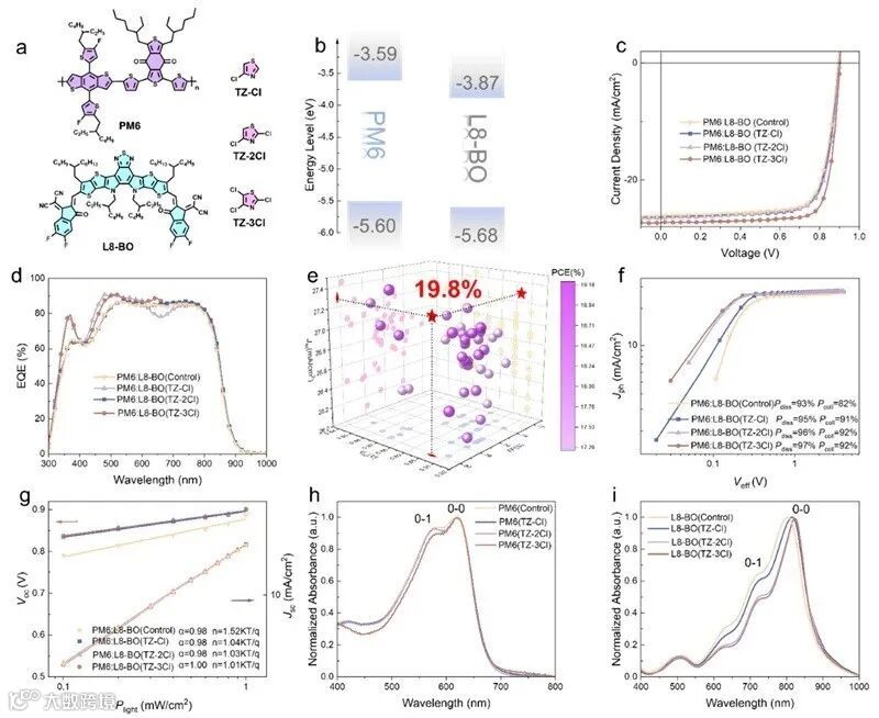 Figure 1. The chemical structures of PM6, L8-BO, TZ-Cl, TZ-2Cl and TZ-3Cl (a); the energy level of PM6 and L8-BO (b); the J-V curves (c) and EQE curves of different systems (d); summary of reported PCE of the corresponding binary OSCs (e); the Jph versus Veff curves (f); the Jsc and Voc versus light intensity curves (g); the UV-vis spectra of PM6 pure films (h); L8-BO pure films (i).