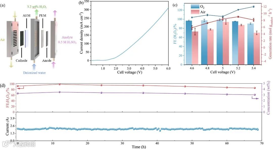 ,法拉第效率可达90.6%。而在装配有固态电解质(SSE)的膜电极组件电解池中以空气作为直接进料,