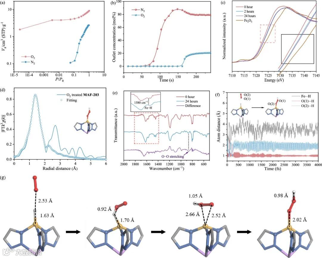 的DRIFT光谱。(f)由AIMD模拟给出的Fe•••H和O•••H的原子距离以及Fe(II)位点演变的示意图。(g) 由AIMD模拟给出的