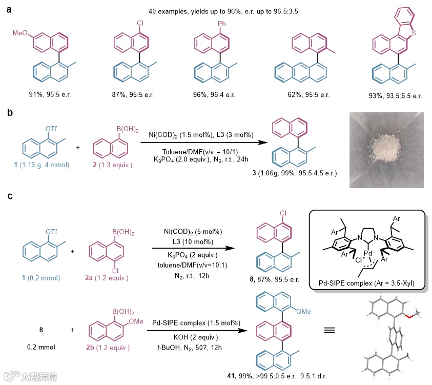 图4. (a) 代表性底物;(b) 克级实验;(c) 非对称三联萘的立体选择性合成