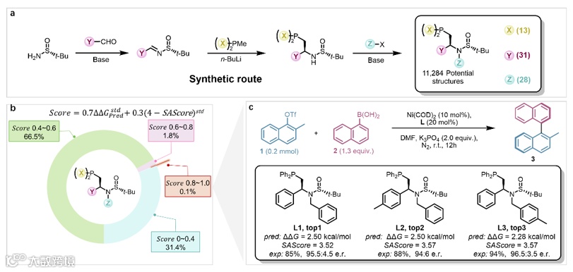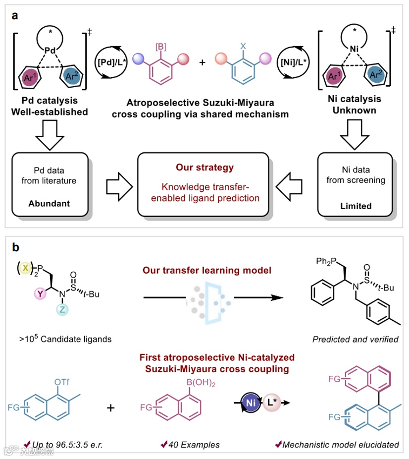 图1. (a) 基于机制联系的迁移学习策略;(b) 智能设计的Ni催化阻转选择性Suzuki-Miyaura交叉偶联反应