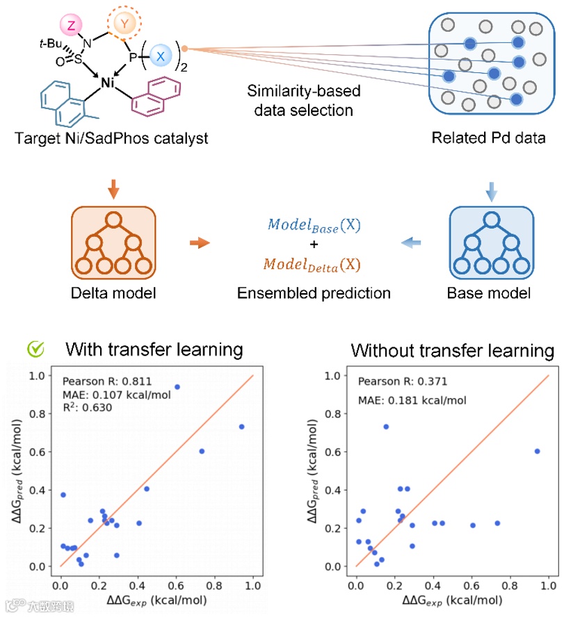 该迁移学习策略的核心在于挖掘手性调控机制的共性,通过共享的反应中间体对Pd与Ni催化数据进行统一编码(图2)。研究团队首先利用文献中大量Pd催化反应数据,构建了稳健的立体选择性“基模型”。在此基础上引入少量Ni催化数据,通过建立独立的“增量模型”,用以捕捉Pd与Ni之间手性构效关系的差异。借助普适关系与局部微扰的协同建模,模型实现了选择性的精准校正和预测效果的显著提升。在仅使用21组Ni催化数据的场景下,采用留一交叉验证(Leave-One-Out, LOO)方式评估模型性能,预测效果可达0.811的皮尔逊相关系数(Pearson R)以及0.107 kcal/mol的平均绝对误差(MAE),显著高于无迁移学习的预测效果(Pearson R = 0.371; MAE = 0.181 kcal/mol)。
