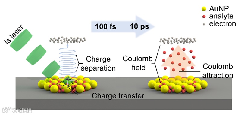 基于此,课题组首次提出了fs-SALDI的库仑场驱动解吸/电离机制,填补了超快飞秒激光在 SALDI 离子化过程中的理论空白,开创了分子电离/成像的新理论新范式。通过飞秒激光激发纳米材料表面等离子体共振(SPR),在极短时间内实现热电子和空穴分离,进而产生库仑爆炸,最终通过库仑吸引作用实现分析物的电离,避免了传统ns-SALDI技术由于热诱导产生的分子碎片化和背景干扰,提升了药物分子的电离效率 1 ~ 2 个数量级。未来,随着更多新型纳米材料的开发和应用,fs-SALDI技术的性能有望进一步提升,为超痕量物质检测和高空间分辨率质谱成像开辟新的道路。