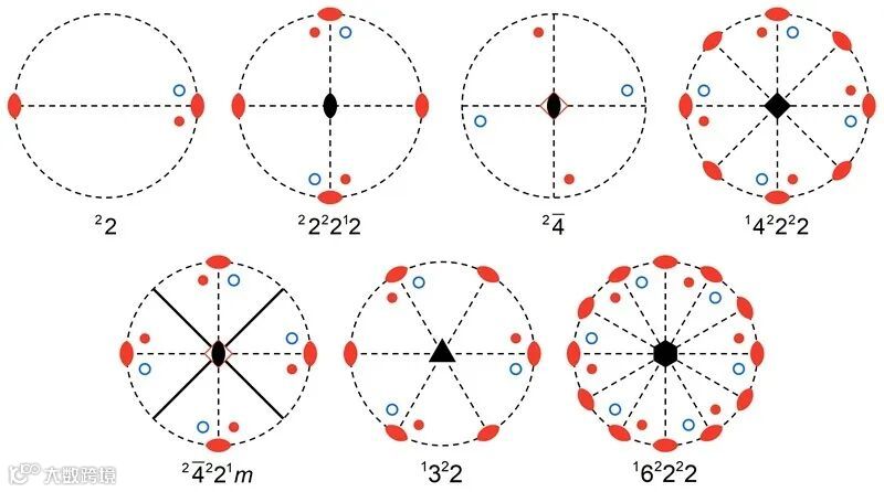 图1. 具有自旋分裂的七种双层交变磁自旋点群的极射赤面投影