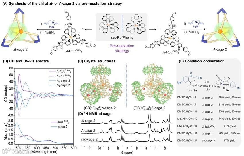 作者通过分子笼限域空腔孔径的定向修饰与改进,成功合成了具有特异性手性光敏口袋的Δ/Λ-MOC-68笼,实现了α,β-不饱和酮和α-羰基烯醇之间的光致不对称串联[2+2]光环加成/acyloin重排过程,生成多种双环[3.2.1]辛烷。本研究不仅实现了首个可见光诱导的不对称串联[2+2]环加成/acyloin重排转化,还为构建手性双环[3.2.1]辛烷提供了一种与经典热力学条件不同区域选择性的合成策略。该工作为通过模拟超分子催化实现复杂有机化合物的对映选择性转化以及笼限域光催化的合成应用奠定了基础。