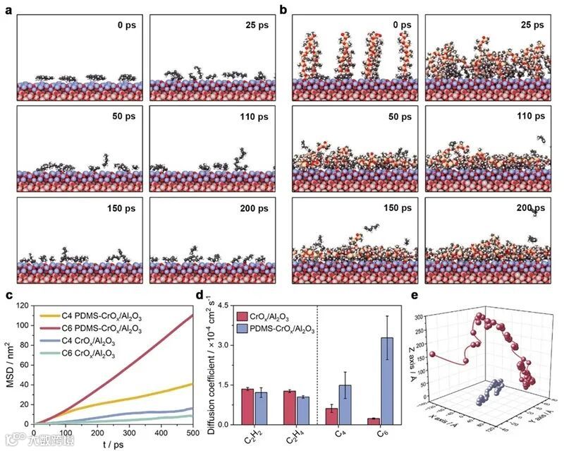 炔烃和烯烃聚合形成的初步产物C4~C6物种与表面作用强,分子动力学模拟结果表明其在未修饰的CrOx/Al2O3催化剂上停留很长时间,可持续增长而堵塞催化剂表面。而引进界面仿生机制之后,催化剂表面上PDMS聚合物分子在不断扭曲、摆动与扫动,链节之间相互缠绕,在运动过程中会持续与表面C4和C6分子发生碰撞,这种相互作用限制了后者在催化剂表面的长时间停留,进而阻碍了链增长聚合过程,最终阻止积碳的形成。这些积碳前驱体分子只能在催化剂表面短时间停留,催化剂即通过这种“自活化”作用而迅速恢复活性,这种方式像极了上皮细胞表面纤毛动态运动主导的生物防御机制。可以预见,这种策略与“自活化”效应能够拓展应用于其他催化剂与催化反应体系中,并发挥新颖的作用。
