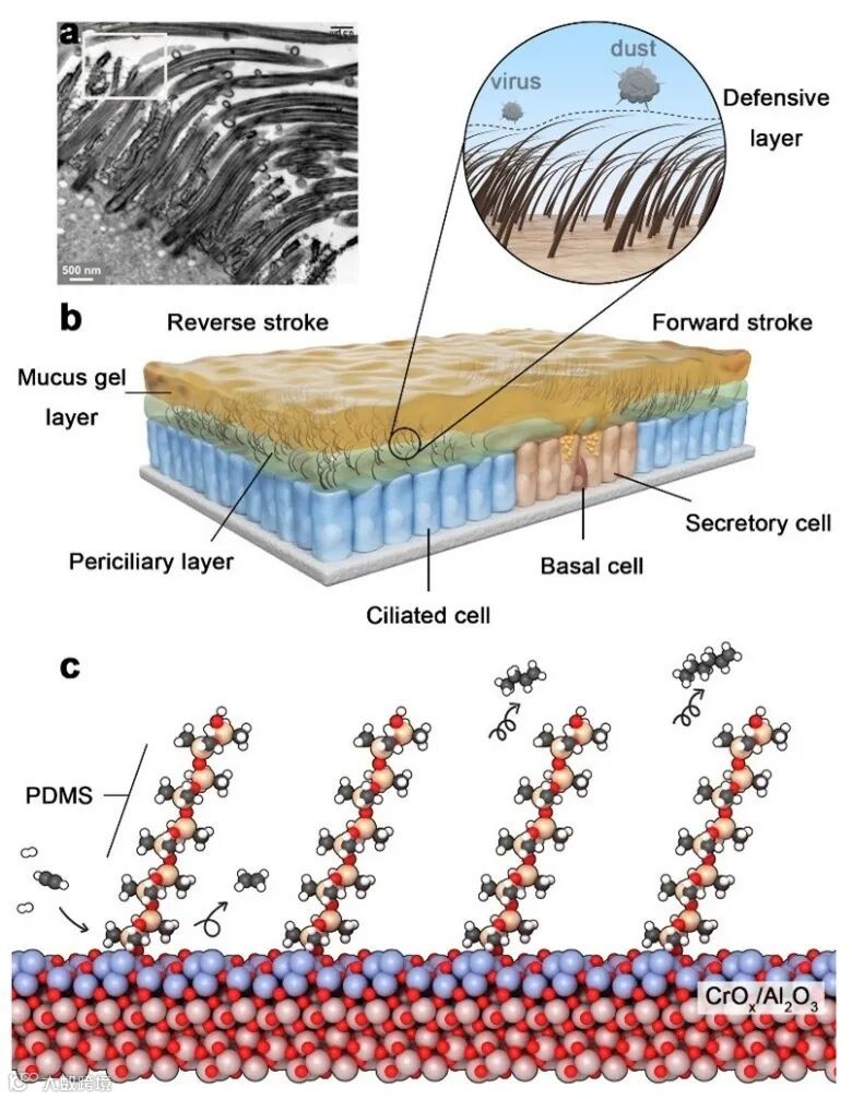 通过模仿自然界中的结构与作用原理,设计和优化合成材料的催化性能,是一种重要的催化研究思路。近期,受细胞表面纤毛动态运动主导的生物防御机制启发,南京大学丁维平教授团队设计并报道了一种新型聚二甲基硅氧烷接枝CrOx/Al2O3的自活化催化剂用于乙炔选择性加氢反应。