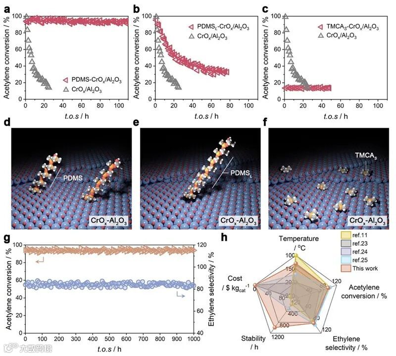 该催化剂在乙炔半加氢反应中展现出与传统贵金属催化剂相当的活性和选择性。除了接枝引起的几何或电子效应外,聚二甲基硅氧烷独特的柔性分子链的“摆动效应”非常关键,其能够对反应中产生的积碳前驱体施加主动扰动,有效避免了碳质沉积引起的位点阻塞,使催化剂在1000小时内保持极高的稳定性。