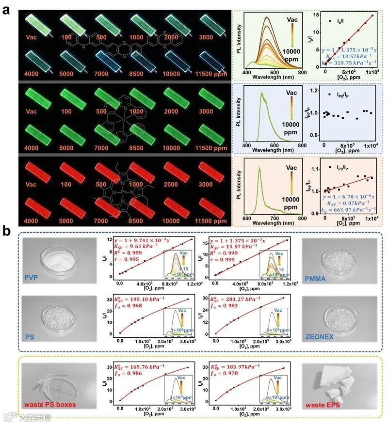 图1. (a) 相同条件下3TA2与商用金属-有机配合物RTP材料Ir(ppy)3和PtOEP的氧气灵敏性对比,(b) 3TA2在不同基质中的氧气传感能力。