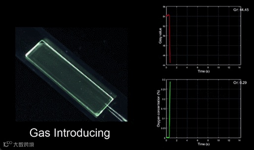 图2. 上半部分:基于视频灰度的氧气浓度实时监测方案的简易实验装置和实现方法;下半部分:利用3TA2的PMMA掺杂薄膜检测实际氧含量0.5%(5000 ppm)的氮氧混合气。