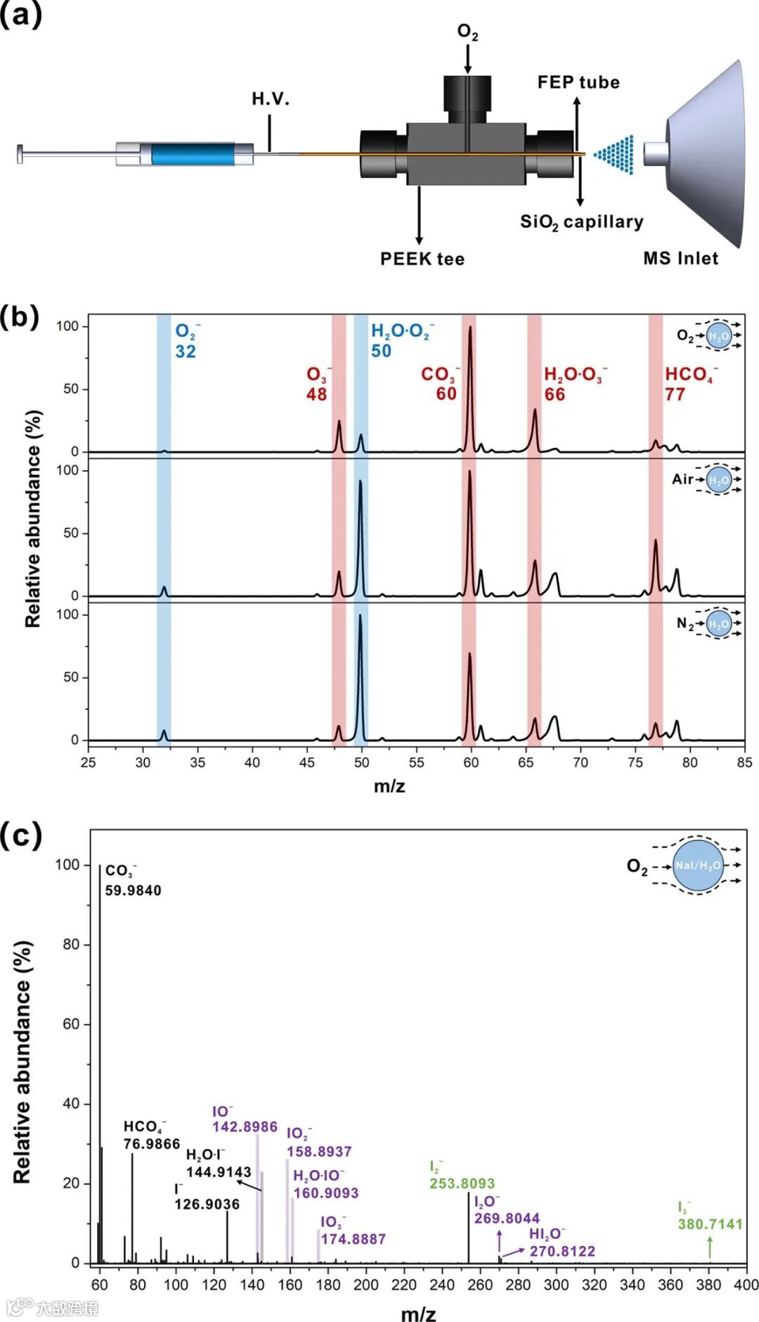 首先,研究人员通过在线质谱检测微液滴水,发现了多种ROS,包括:O2−、O3−、H2O·O2−、H2O·O3−、CO3−和HCO4−。进一步发现,液滴周围气体组分能够显著影响ROS组成与含量。通过碘化物氧化、捕获剂捕获等手段证实了微液滴能够裂解周围的氧气,裂解后的氧气与水、氧气或者二氧化碳进一步反应生成多种ROS。