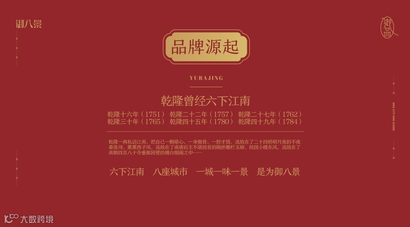 从文化的维度构筑“御八景”的品牌文化,既有庙堂之高的高贵典雅,亦有江湖之远的人间烟火。从今后品牌拓展的维度建立“御八景”品牌“一城一景一个主打味道”的场景建设,为今后的品牌拓展奠定坚实的文化背书。